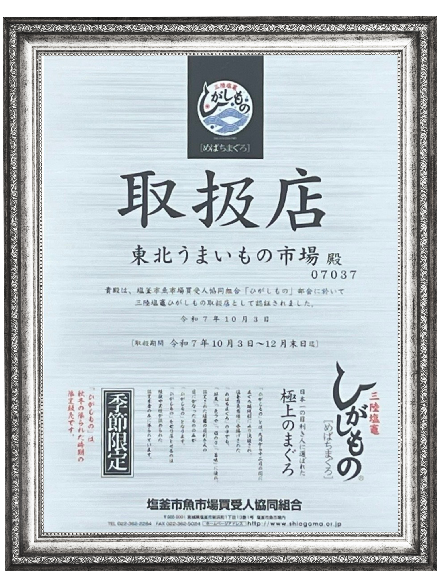 三陸塩釜ひがしものとは、9月〜12月にかけて塩釜市魚市場に水揚げされるメバチマグロのうち、塩釜にいる日本一の目利き人(仲買人)の目によって厳しい条件をクリアした、「鮮度」「色つや」「脂のり」「旨み」に優れているメバチマグロの事を言います。その希少性はなんと100本に1本!300本揚がって1本もないこともしばしば。